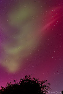 Was dann aber nach Mitternacht noch am Himmel los war, war spektakulär. Wir standen im eigenen (!) Garten und wussten nicht mehr, in welche Richtung wir zuerst schauen sollten. Die einzelnen Farben am Himmel waren mit dem Auge deutlich erkennbar, es war alles dabei. Das Polarlicht reichte bis zum Zenit, und dass ich nicht mehr weiß, wohin ich die Kamera drehen soll, kenne ich nur von "explodierenden" Nordlichtern in Island oder Nordnorwegen.